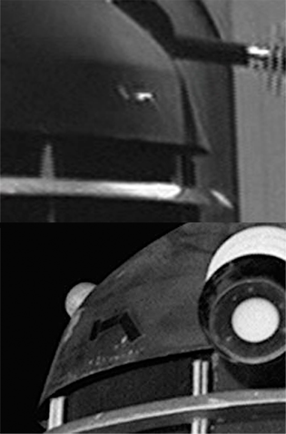 Soon after receiving its full black paint job, Dalek Two took some damage to its dome and a large scratch appeared revealing the silver beneath. This was quickly patched up with some black tape but due to the nature of the TV cameras in this period, the tape can barely be seen onscreen.